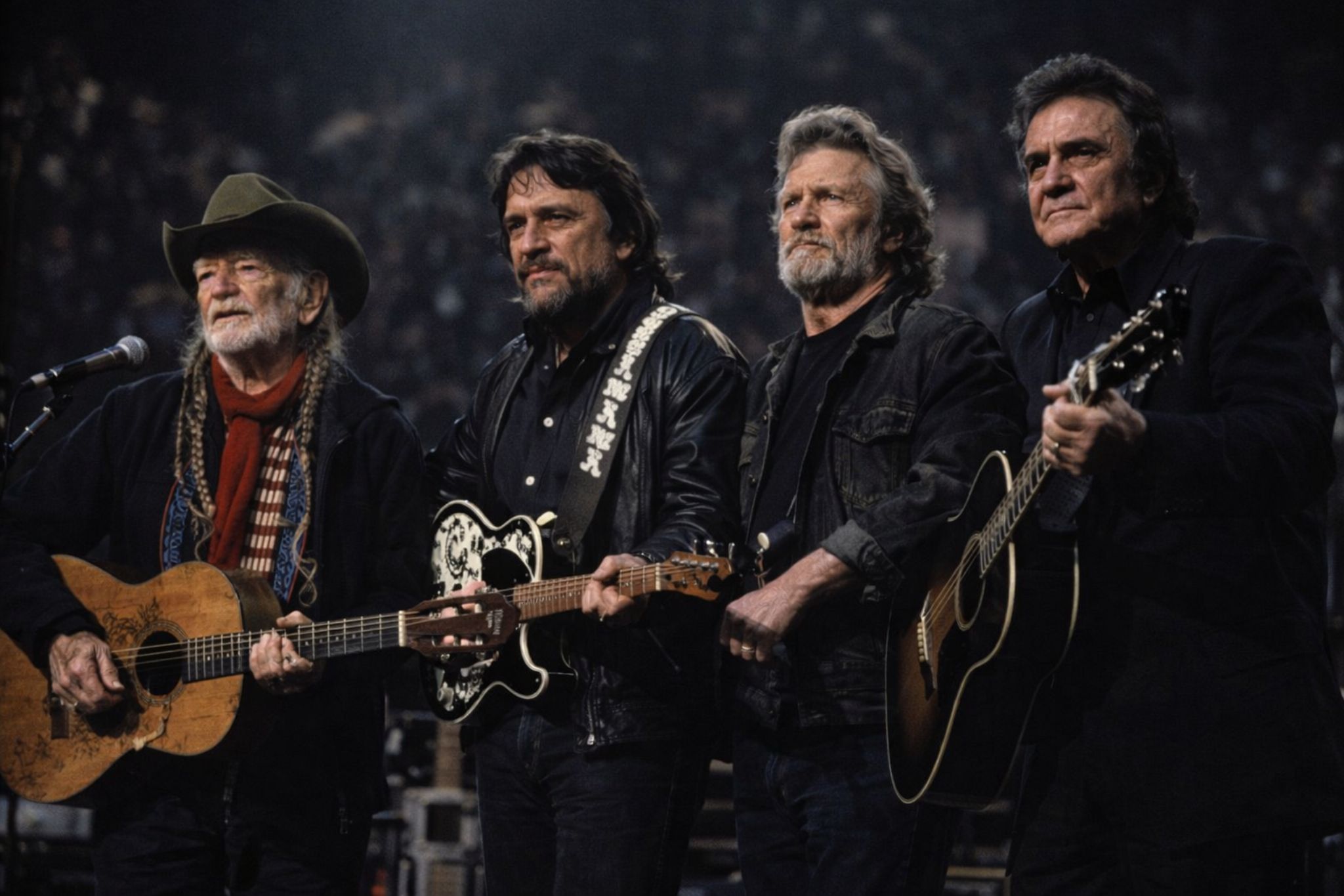 Picture it under a wide American sky: no flashy introductions, no fireworks insisting you feel something. Four men step onto the same stage, and the reaction isn’t hysteria—it’s recognition. These aren’t performers chasing relevance. These are survivors, men who lived through the years when Nashville wanted country music to stay neat, polite, and profitable. Instead, these voices—Willie NelsonWaylon JenningsKris Kristofferson, and Johnny Cash—spent their lives proving that truth matters more than approval.